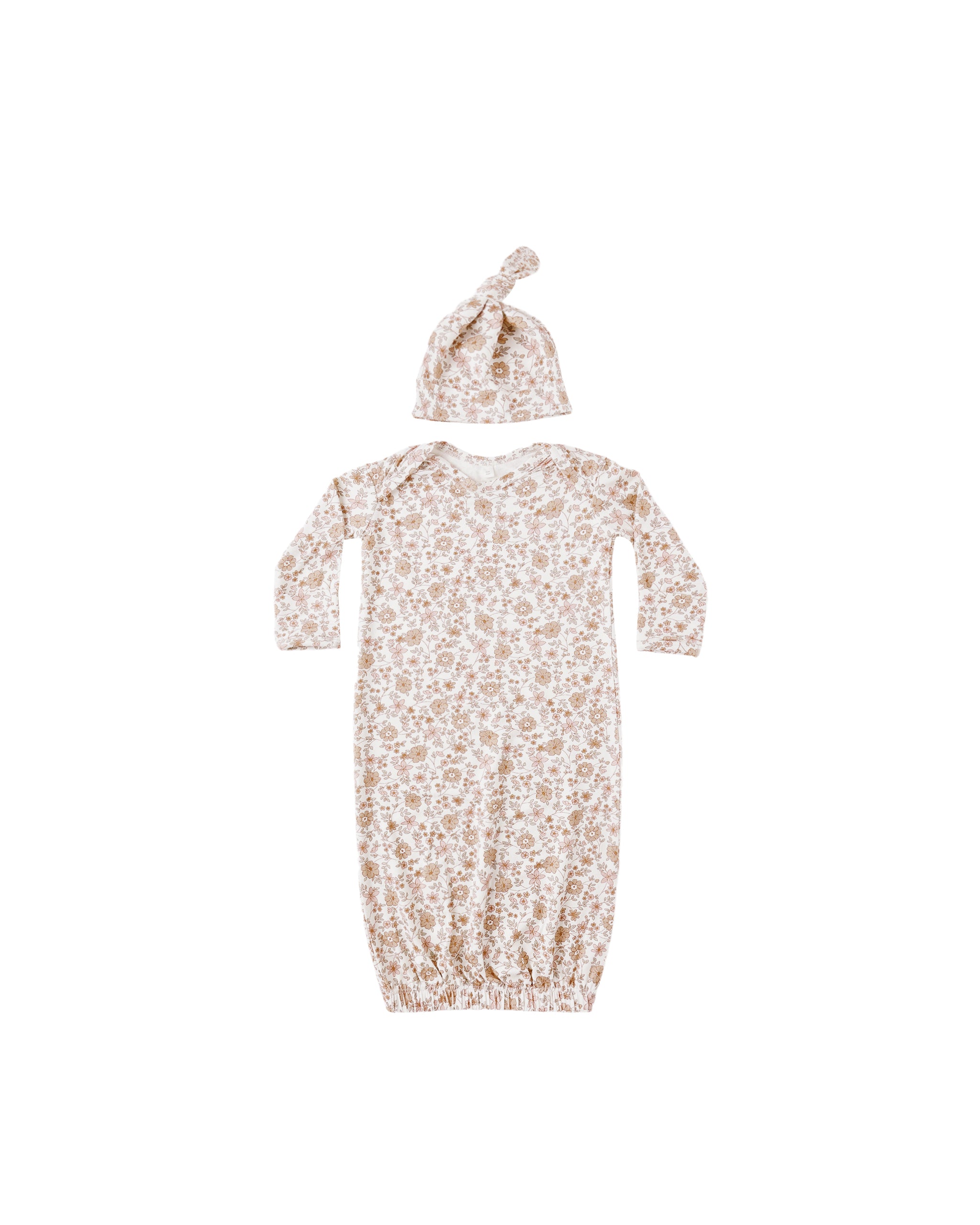 Crafted from signature soft and stretchy bamboo fabric, this baby gown features an elastic bottom opening and fold-over hand mitts, paired with a coordinating knotted hat for cozy comfort.