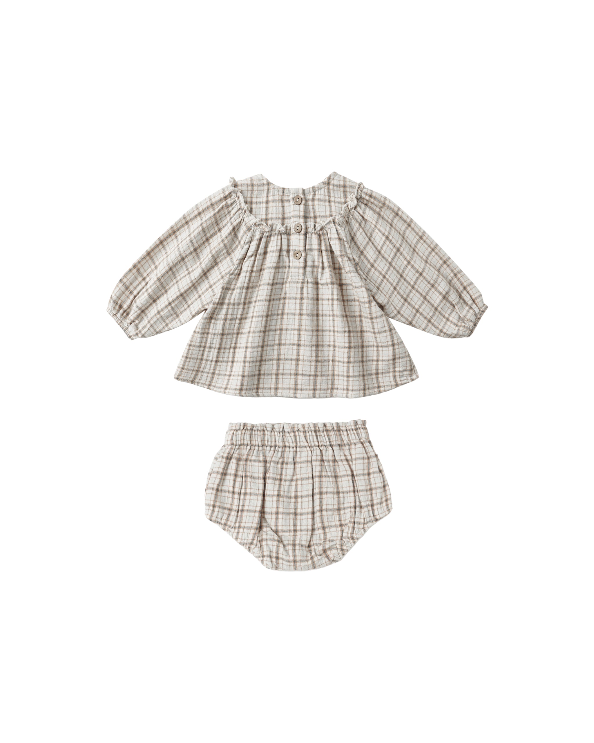 This darling set features a full gathered blouse with delicate ruffle detail, balloon sleeves, and a button-back closure, paired with matching bloomers for the perfect finishing touch. A timeless, must-have addition to your little one’s wardrobe.