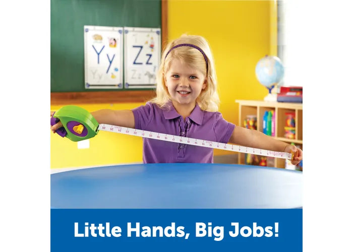 A must-have tool for little explorers and doers! Children will love working with this perfectly-sized, manual-wind tape measure. Appealing, contemporary design and simplified features (inches and feet on one side of the tape, centimeter and meter on the other). Measures up to 4 feet-perfect for comparing heights!