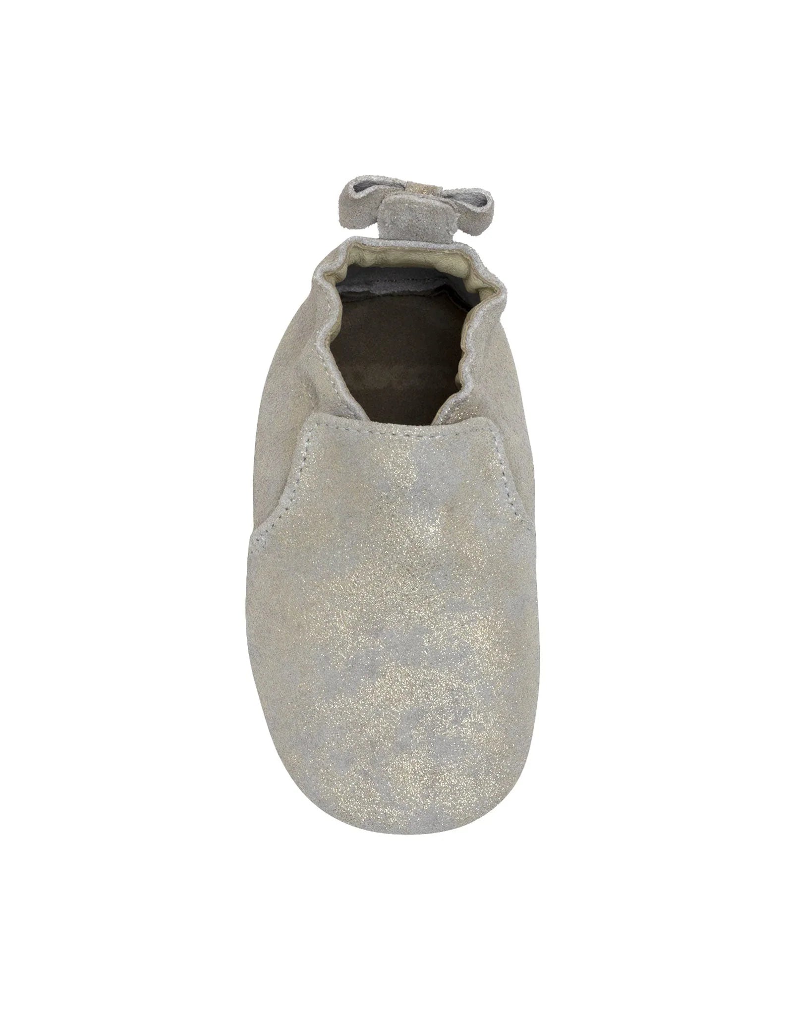 Robeez Pretty Pearl Soft Soles in Gold are comfortable baby slip-ons made with a premium suede upper in sparkly gold and a neutral brown suede on the sole. A shiny, metallic gold leather strip runs up and down the heel with a matching stand-up bow. A roomy fit and flexible material allow your baby's feet to flex naturally and grow up strong. These soft bottom baby girl shoes are carefully designed with the best materials and craftsmanship for your baby's health, comfort, and safety.