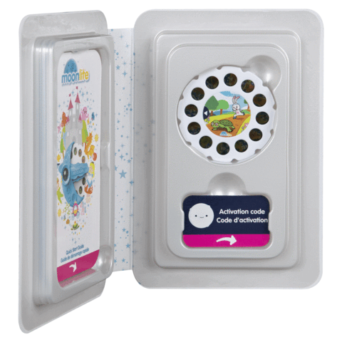 The Tortoise and the Hare works with Moonlite’s storybook projector (sold separately). Insert the story reel into the Moonlite projector, clip the projector onto your smartphone (not included) and project beautiful and vibrant storybook illustrations onto any surface! Snuggle in with your child and enjoy beautiful and vibrant illustrations, along with in-app story text and sound effects!